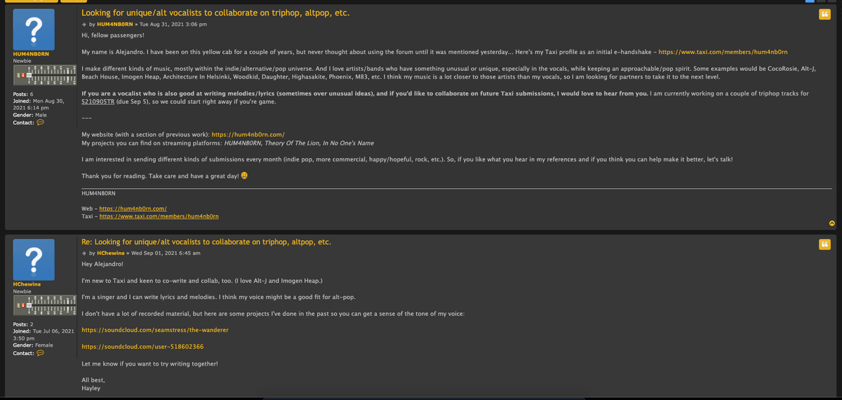 I replied, and Alejandro and I ended up making a trip hop song together, which we pitched for one of the listings. It didn't go anywhere, but that didn't matter: our musical partnership had begun.